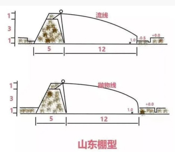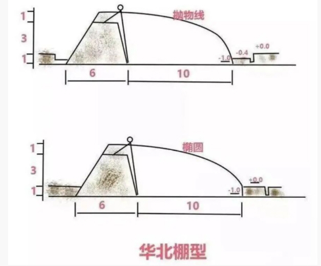 特點:后墻到頂并加厚,保溫蓄能;太陽入射角較低,棚面弧度加大;遇到冬雪、春雨氣候,適合覆蓋草簾和覆膜,地下水位深,畦內(nèi)種植。
